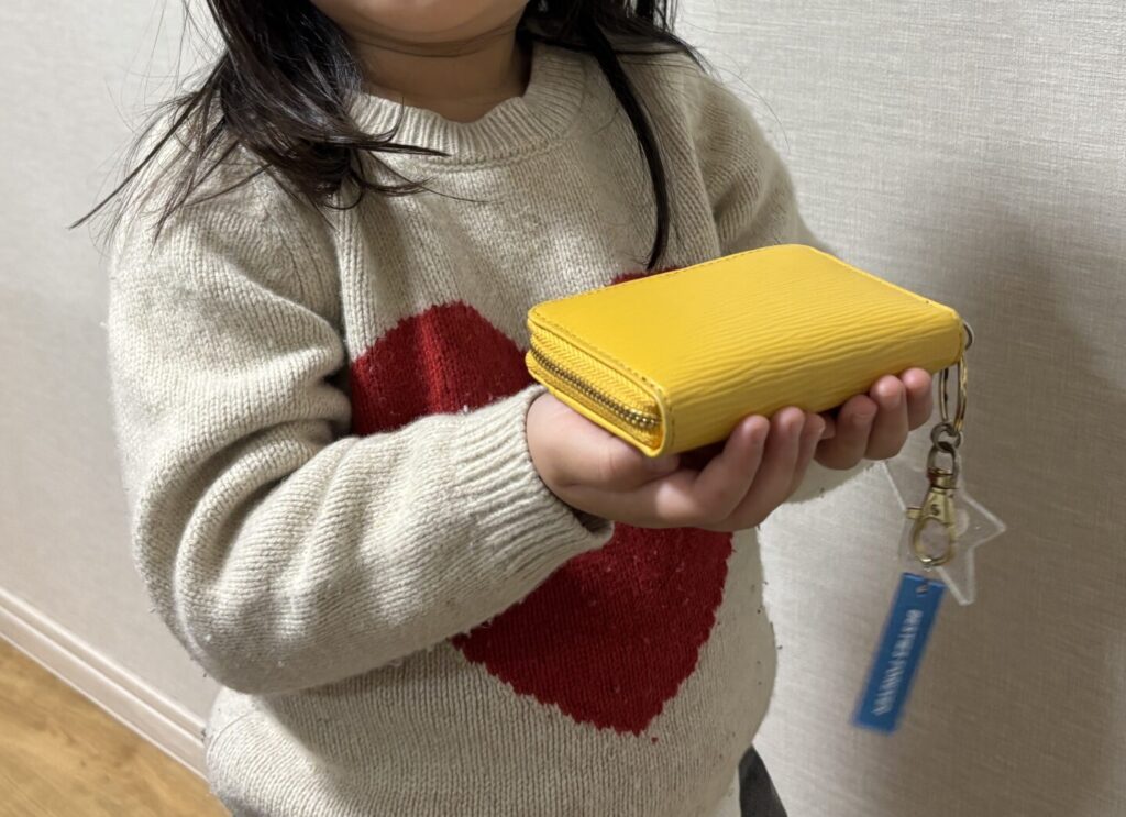彼女のお財布には、お兄ちゃんの時の経験を活かし、可愛さと実用性を兼ねた「ベルトフック付きのキーホルダー」を付けました。落とさないための対策も、準備万端です。